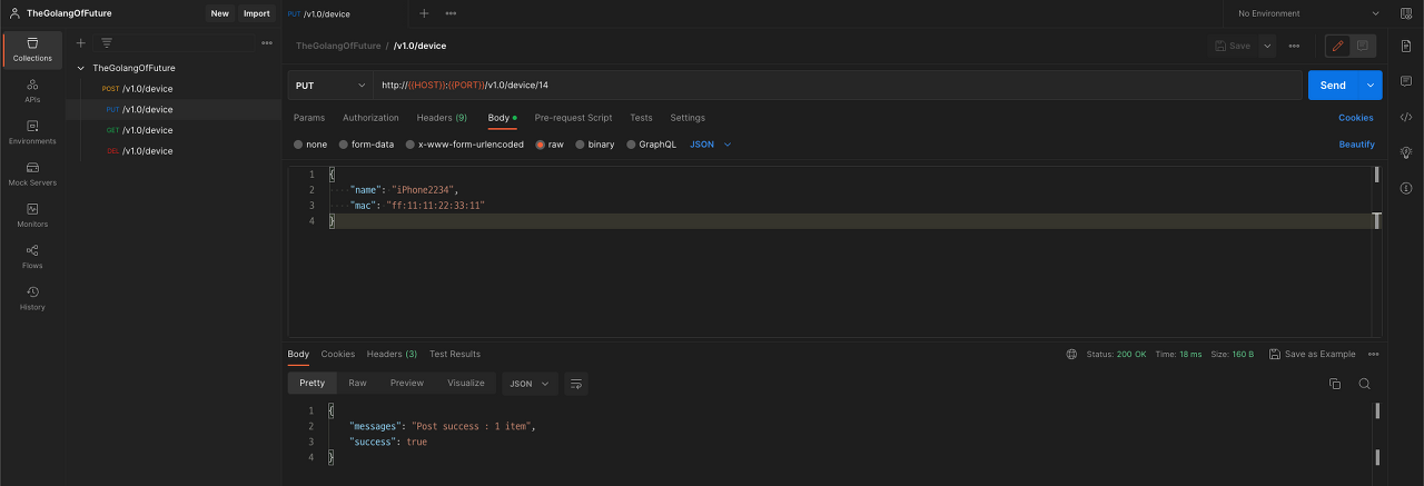 fmt.Printf("[PUT] Id=%s, Name=%s, Mac=%s\n", id, device.Name, device.Mac) // DB insert