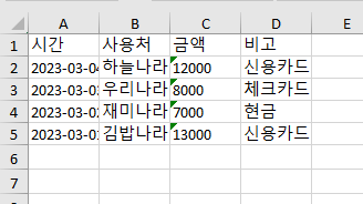 {"2023-03-01 11:66", "김밥나라", "13000", "신용카드"},